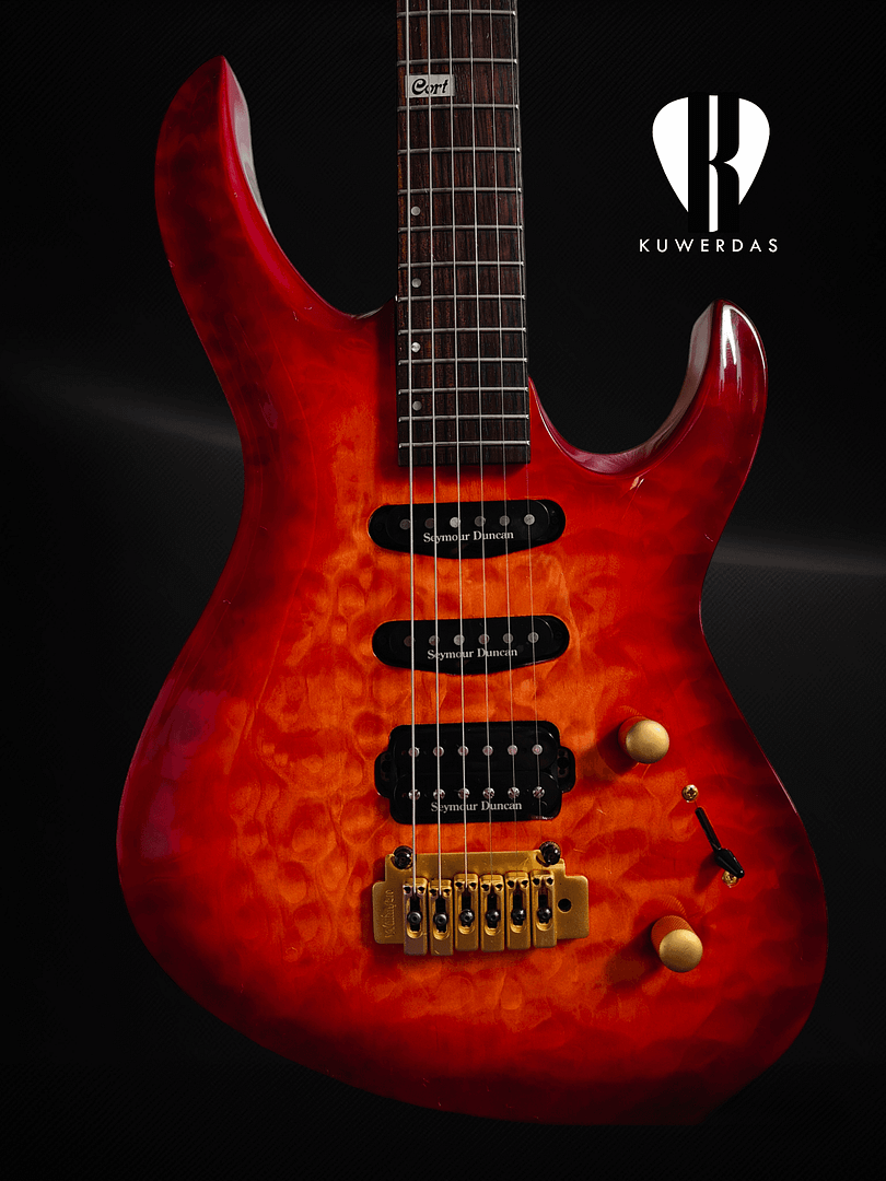 The craftsmanship of the Cort S2900 is further exemplified by the use of solid quilted maple and Seymour Duncan pickups. These premium materials contribute to the overall sound richness and aesthetic appeal, while the rosewood fingerboard and bolt-on neck enhance playability and comfort, making it an excellent choice for both practice and performance sessions.